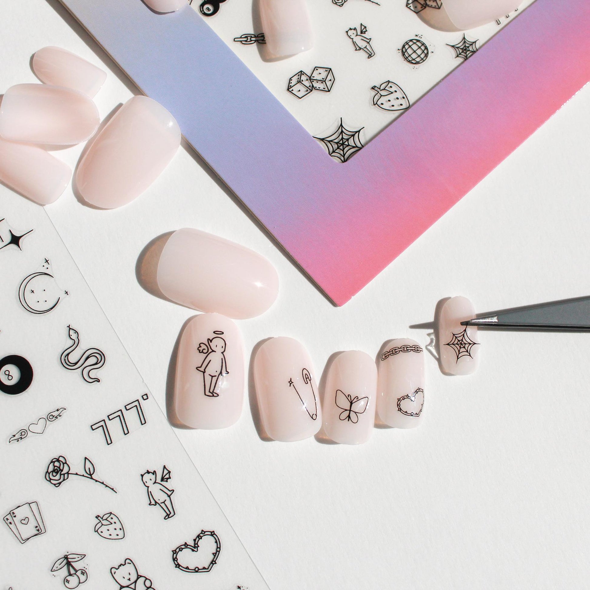 Our 777 Nail Art Stickers are hand-drawn and inspired by fine line tattoos. Pair them with our Birthday Suit Press-On Nails to create your own customized nails.