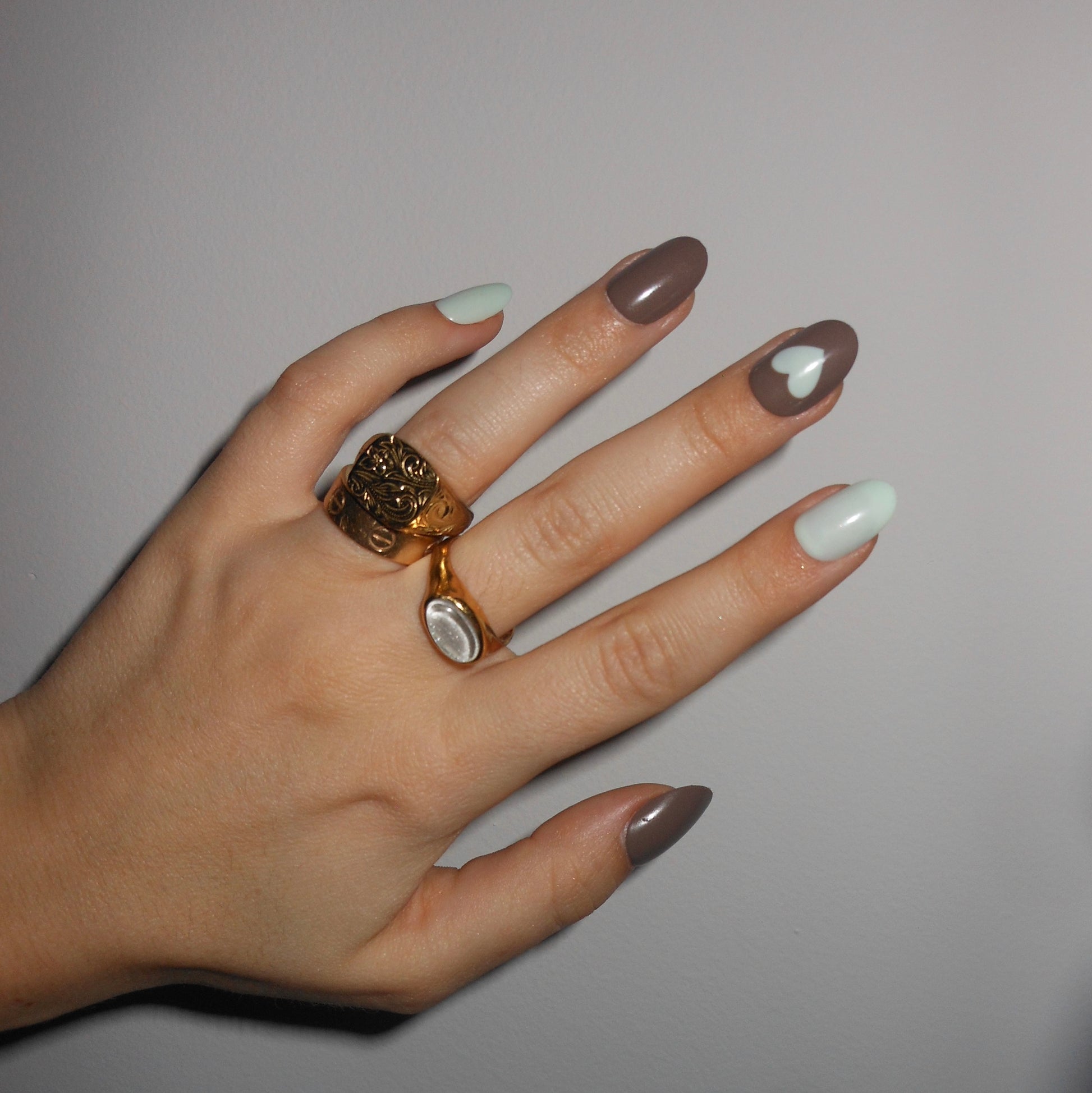 This chocolate brown and mint green set will steal your heart. It's on our short round nails, which give you a natural look with a short length.