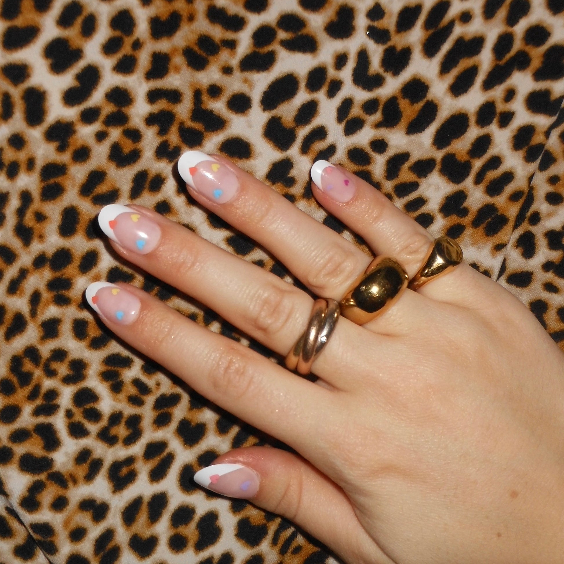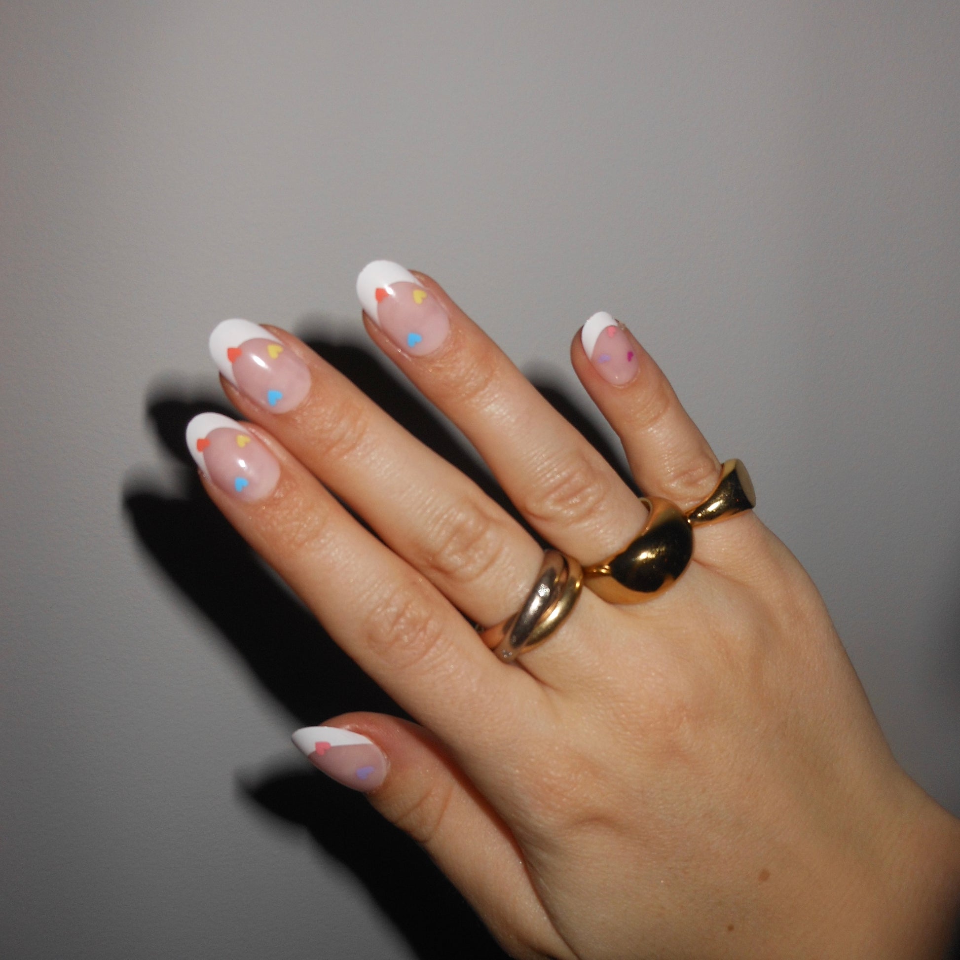 The sweetest mini multi-colored hearts with a french tip. It's on our short round nails, which give you a natural look with a short length.