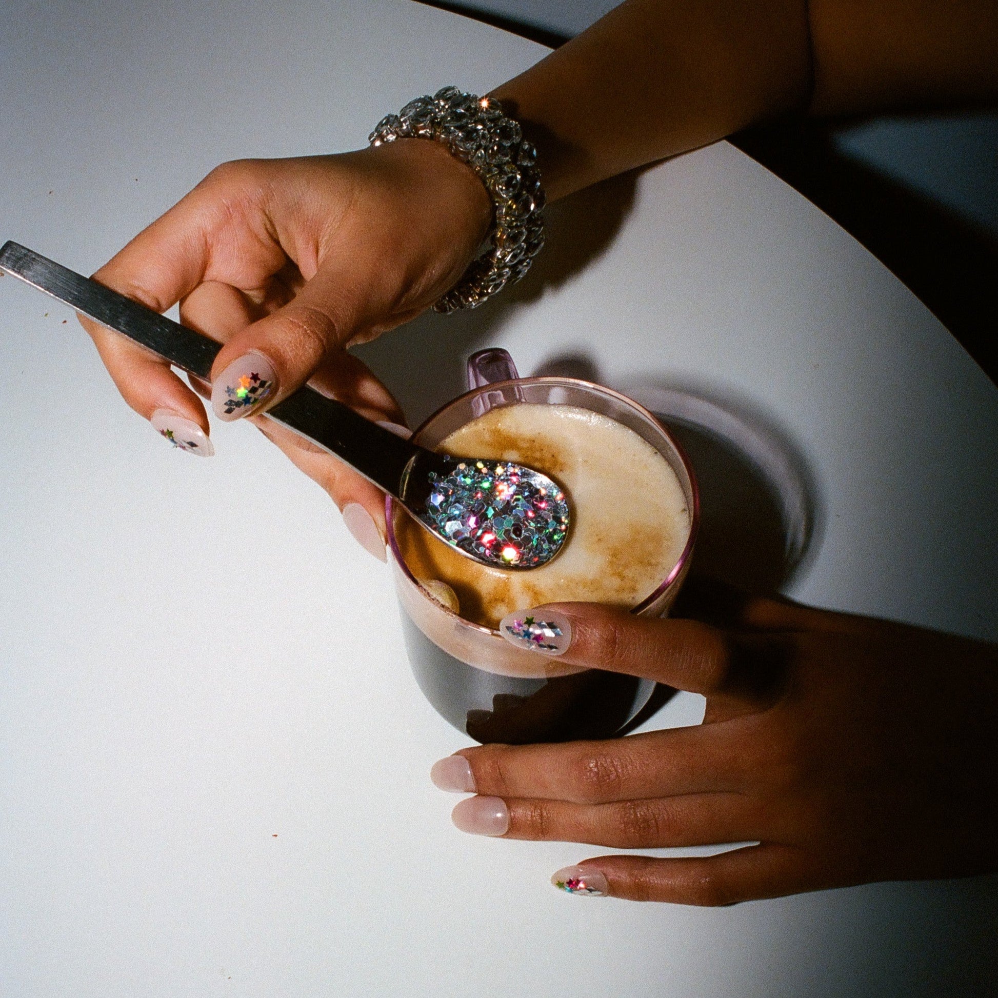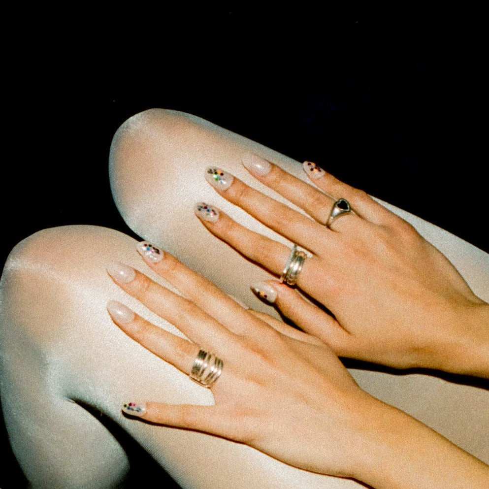 Each star and sequin has been placed by hand on these nails so that you can bring the party (& confetti) everywhere you go. It's on our short round nails, which give you a natural look with a short length.