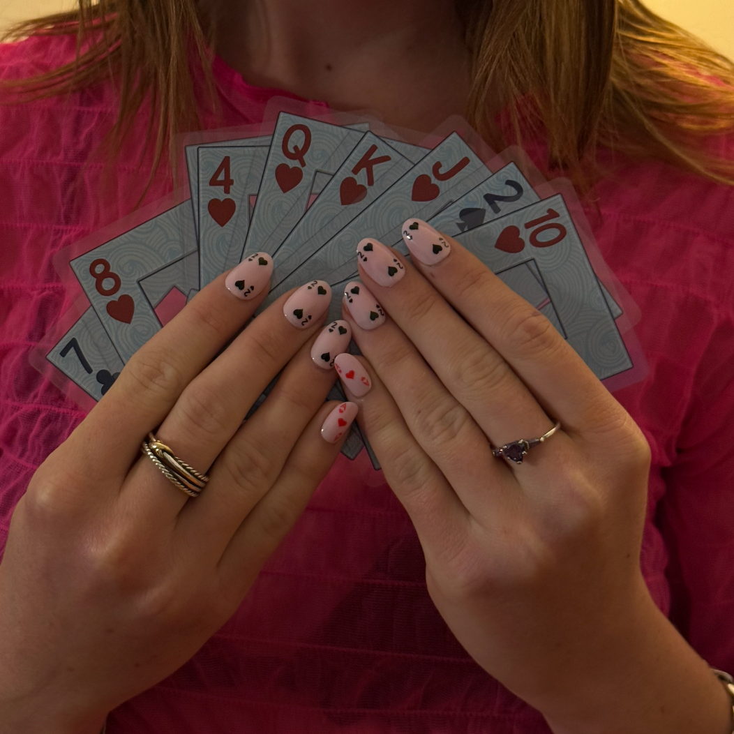 Texas Hold 'Em! Go all in on with our deck of cards design set against a pale pink background.