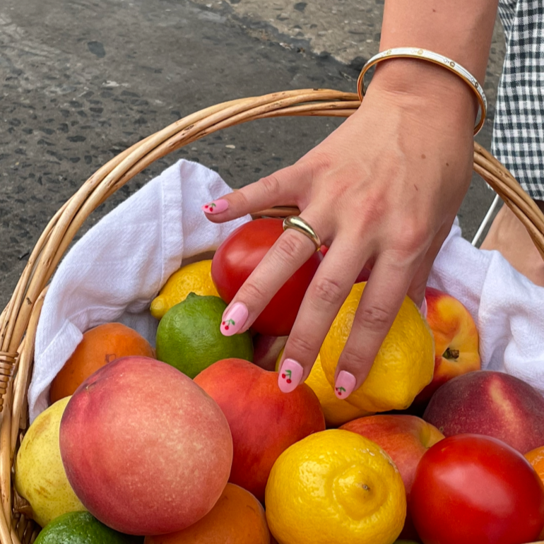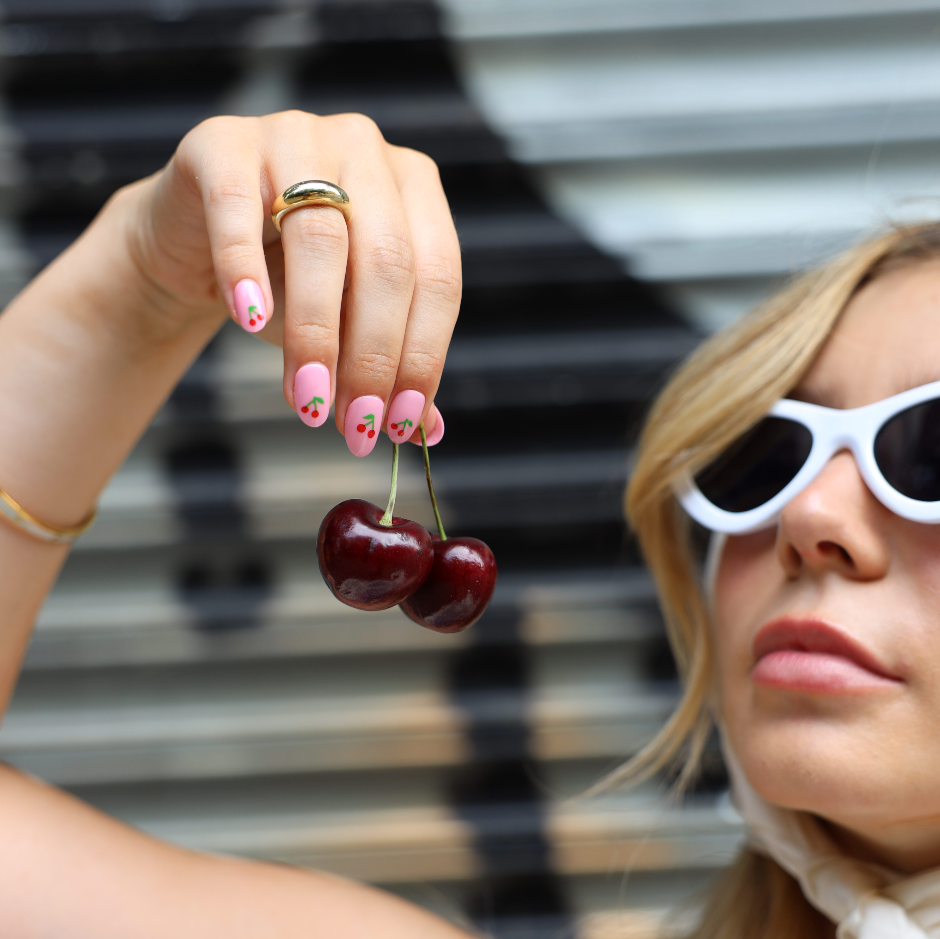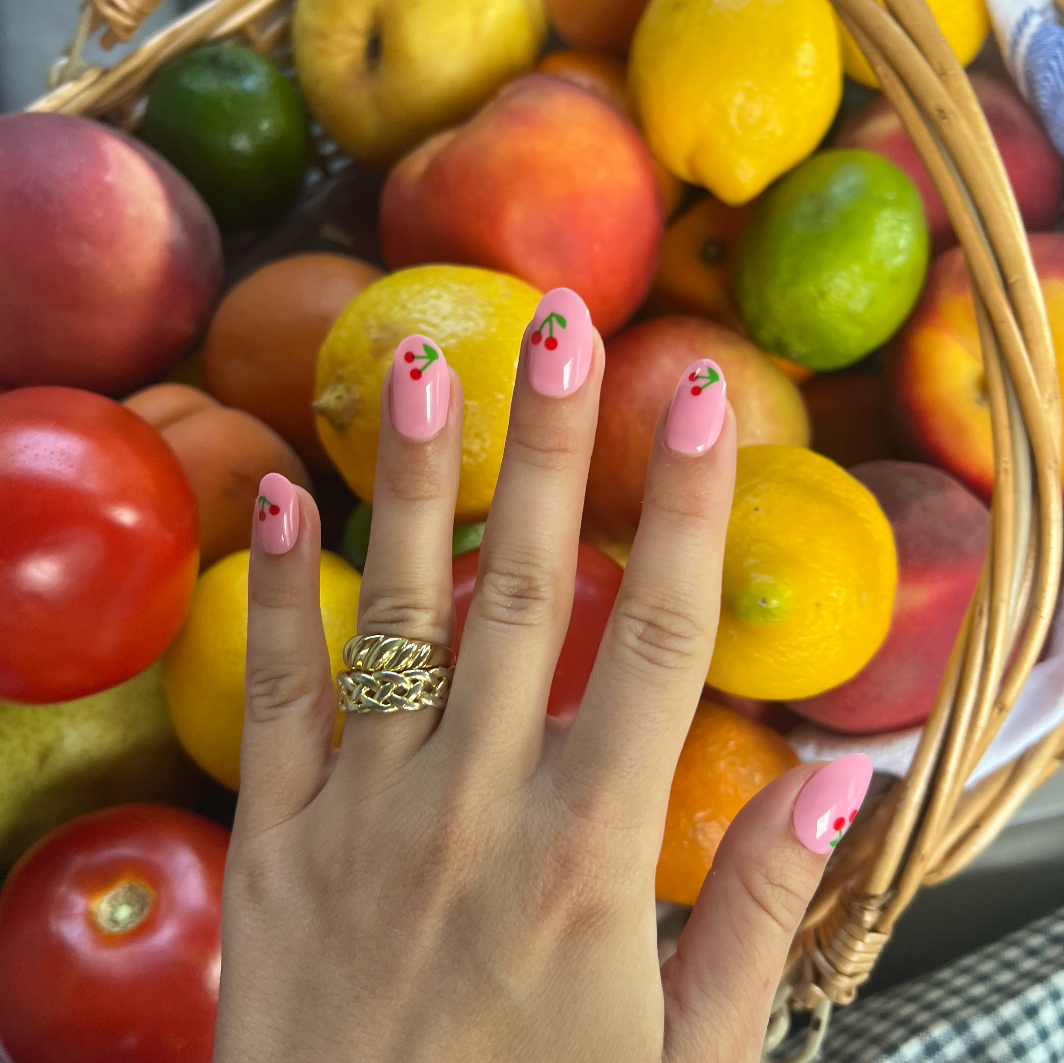 Our hand-drawn pink cherry print is the perfect summer treat for your nails.